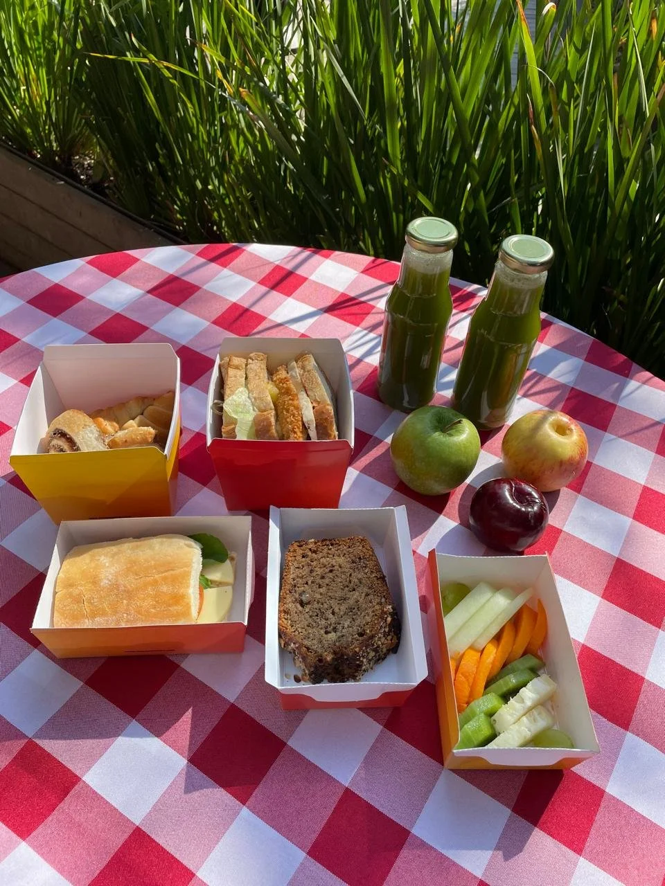 O Picnic tradicional, leva um Club Sandwich plant-based, um Bocata di Cardinale, duas fatias de banana bread, dois mini croissants plant-based, dois mini cinnamon rolls, frutas fatiadas, frutas inteiras, suco detox, toalha quadriculada e talheres sustentáveis. Disponível para 2 pessoas.